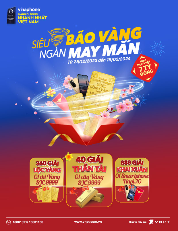 Từ ngày 25/12/2023 đến hết 18/02/2024, VinaPhone tưng bừng khuyến mại đón Tết Dương Lịch 2024 và Tết Nguyên Đán Giáp Thìn. Tất cả khách hàng tham gia sẽ có cơ hội trúng ngay 40 giải Thần Tài mỗi giải 01 cây vàng SJC 9999, 360 giải Lộc Vàng mỗi giải 01 chỉ vàng SJC 9999, 888 giải Khai Xuân mỗi giải 01 smartphone Hapi20. Tổng giá trị giải thưởng của chương trình lên đến gần 7 tỉ đồng.
